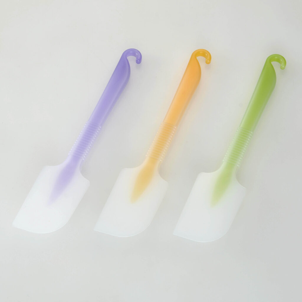 混色成型により、カラフルなデザインと異素材を組み合わせる事で、持ち手を固くしっかり持てるようし、先端は柔らかくすることで使いやすさを実現ました。